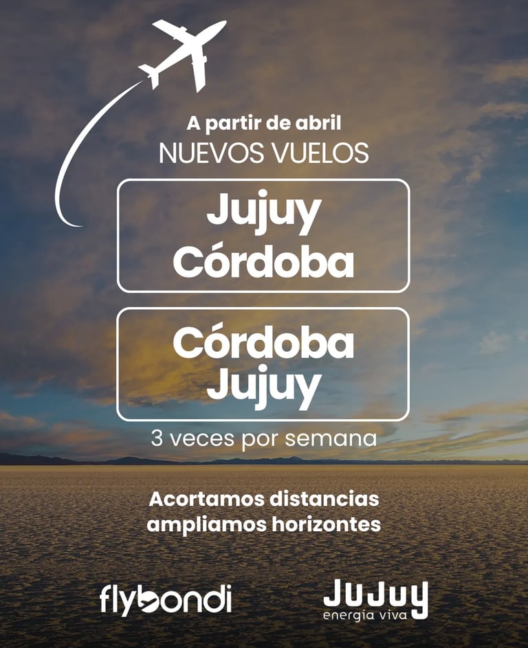 El Ministerio de Cultura y Turismo de la Provincia de Jujuy anunció la incorporación de una nueva ruta aérea que conectará Jujuy con Córdoba y Córdoba con Jujuy, la frecuencia será de tres vuelos semanales, fortaleciendo la conectividad y ampliando las oportunidades de desarrollo turístico y comercial.